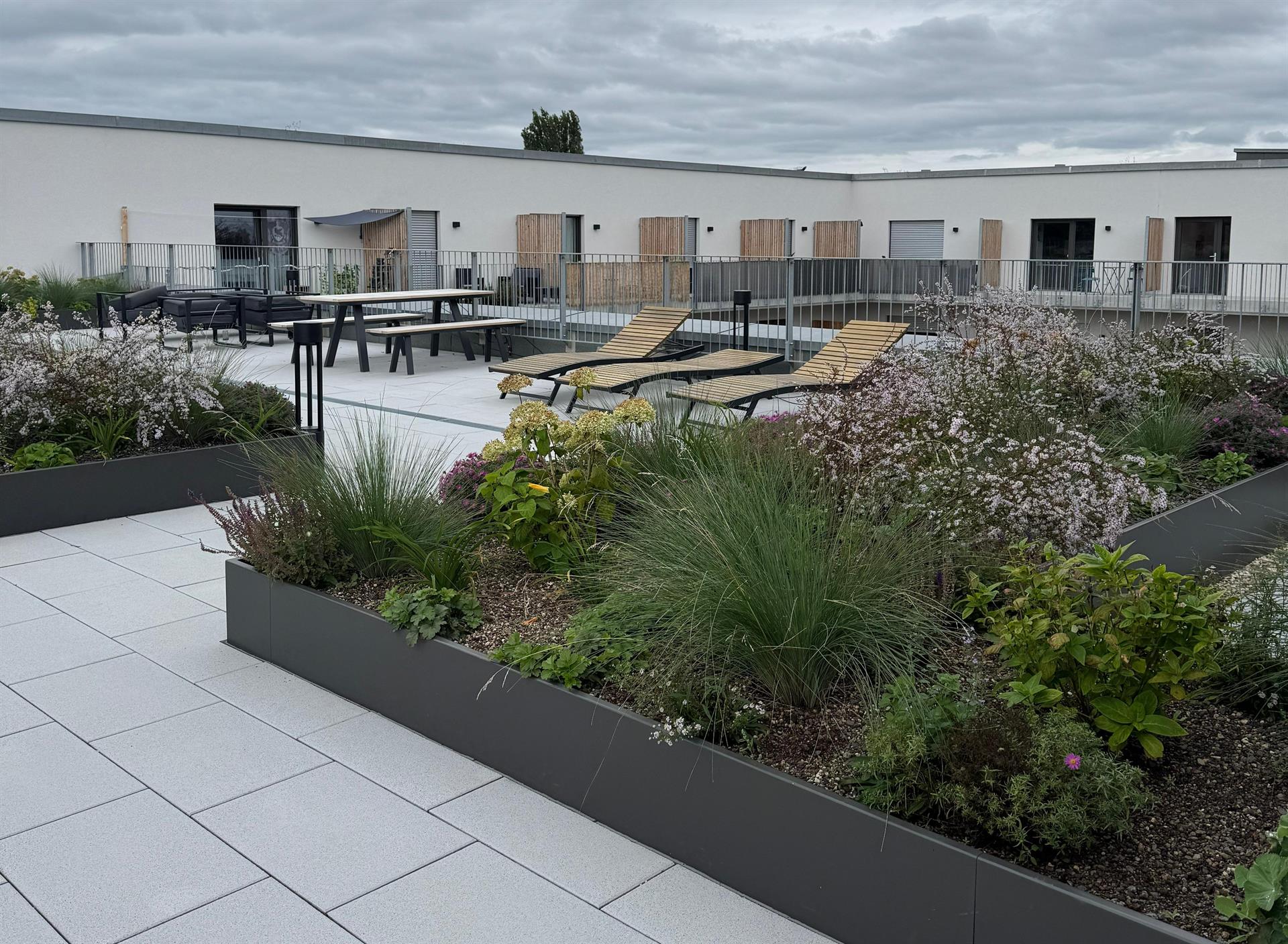 Auch fachgerecht geplante und ausgeführte Dachbegrünungen wirken als Hitzeschutz an heißen Sommertagen. Für den Wohnkomplex Kuni 71 in Nürnberg verwirklichte John Garten-, Landschafts- und Sportplatzbau intensive Bepflanzungen auf den Flachdächern des Anwesens und der Tiefgarage – einschließlich Retentionstechnik. Der Dachgarten kann zudem betreten und vielfältig genutzt werden, zum Beispiel als grüner Rückzugs- und Erholungsort. Für die Erweiterung des Erlanger Familienzentrums Röthelheim, ein inklusiver Kindergarten der Lebenshilfe, installiert der Betrieb ebenfalls eine Dachbegrünung.