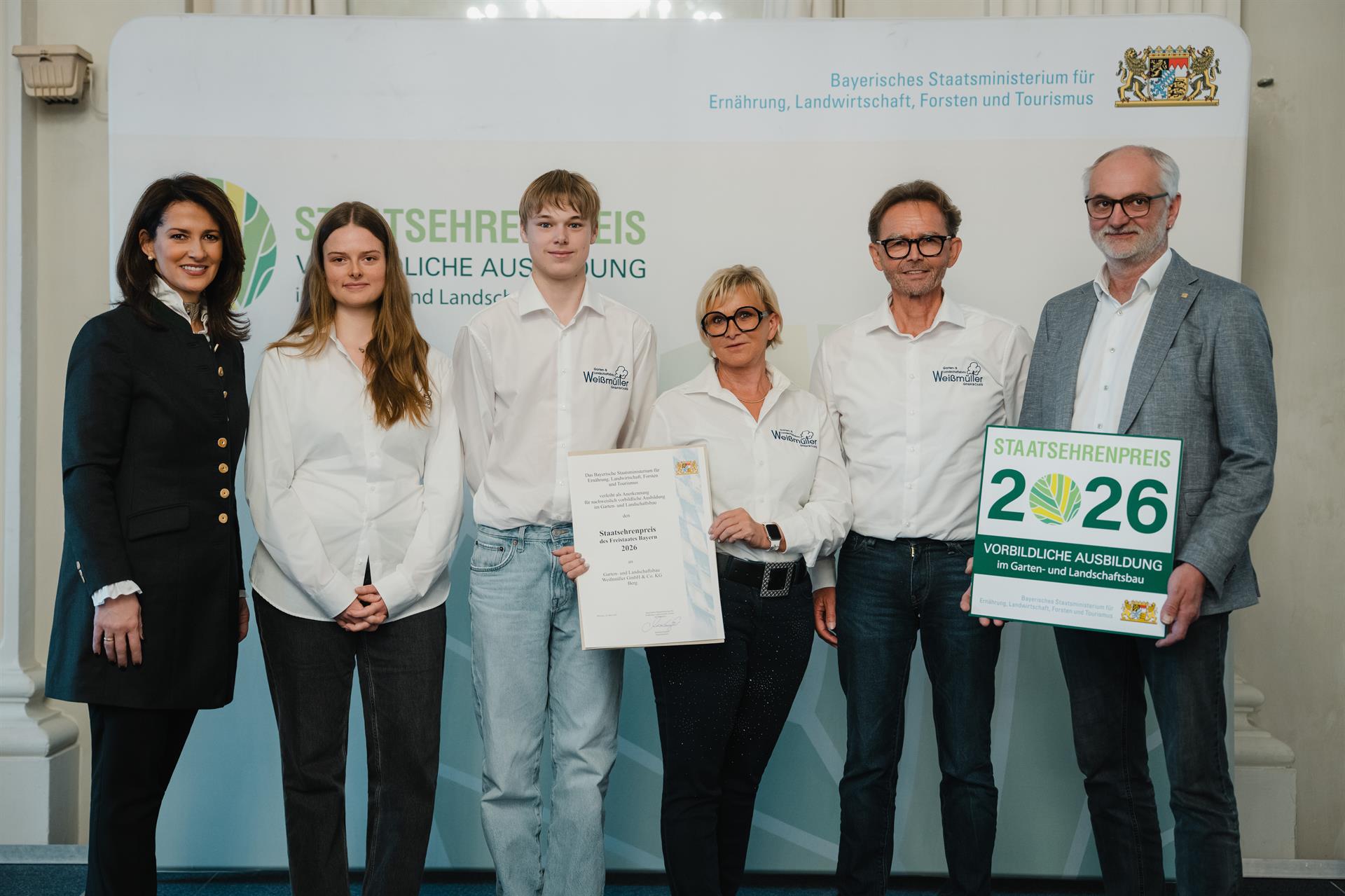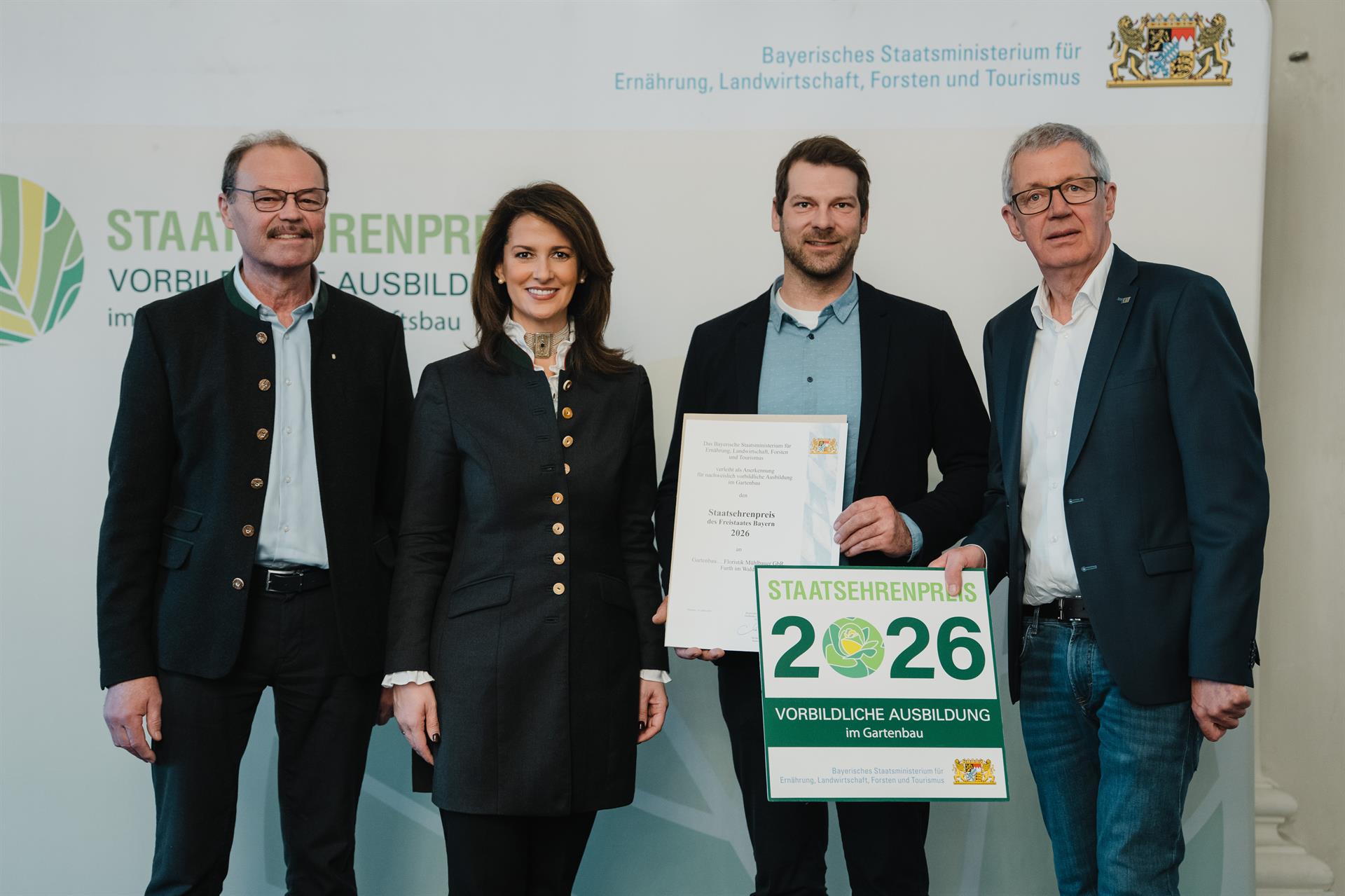 Für ihr außergewöhnliches Engagement in der Qualifizierung von Nachwuchskräften hat die bayerische Agrarministerin Michaela Kaniber 41 gärtnerische Betriebe – darunter drei aus der Oberpfalz – mit dem Staatsehrenpreis für vorbildliche Ausbildung 2026 geehrt. Die feierliche Preisverleihung fand am 12. März 2026 in der Münchner Residenz gemeinsam mit dem Verband Garten-, Landschafts- und Sportplatzbau Bayern und dem Bayerischen Gärtnerei-Verband statt.