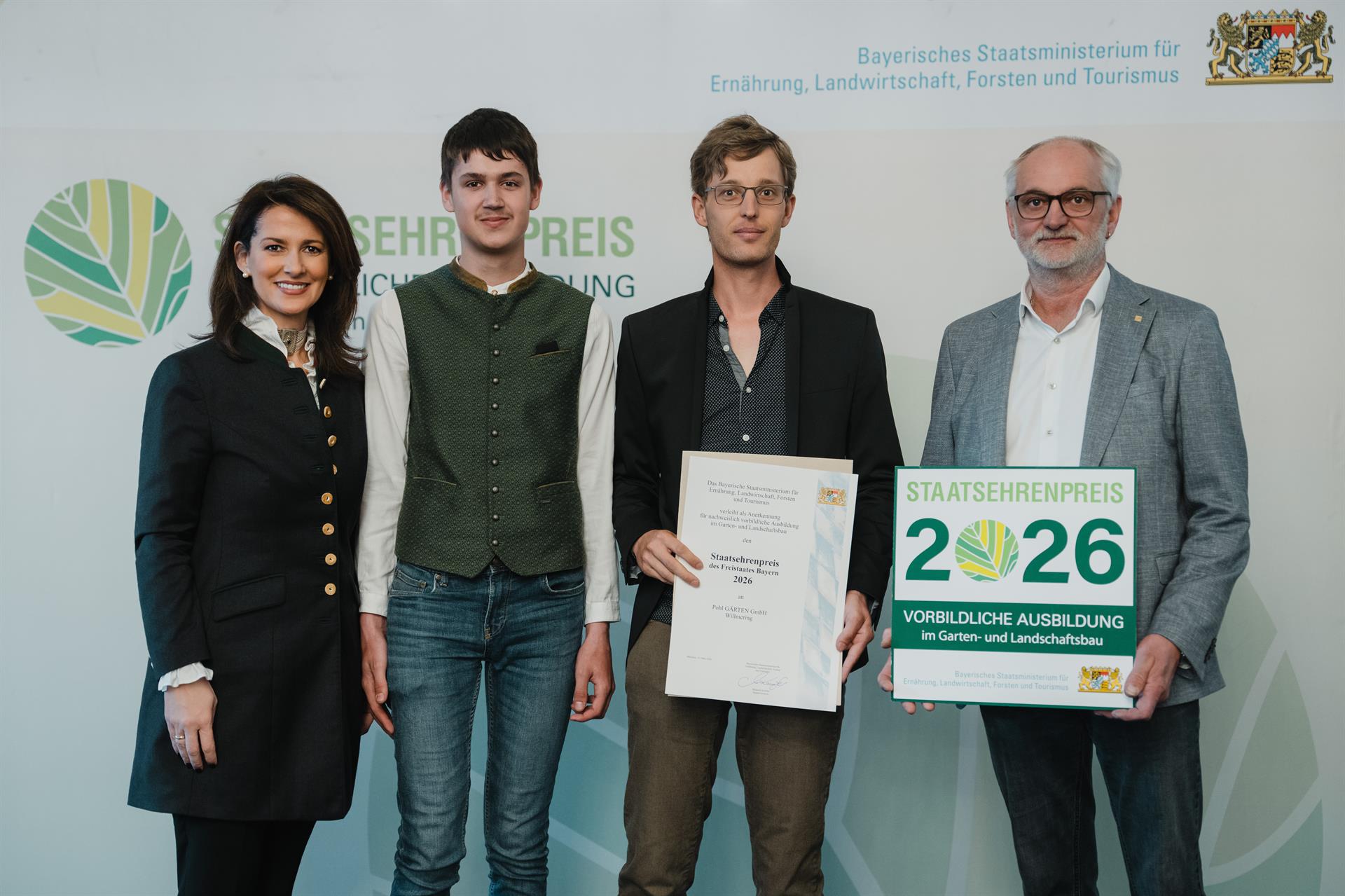 Zu den ausgezeichneten Unternehmen zählen Pohl Gärten aus Willmering und Garten- & Landschaftsbau Weißmüller aus Berg bei Neumarkt i.d.OPf. Sie erhielten den Staatsehrenpreis für vorbildliche Ausbildung im Garten- und Landschaftsbau, überreicht von Ministerin Kaniber zusammen mit dem Verband Garten-, Landschafts- und Sportplatzbau Bayern (VGL Bayern). Zusätzlich durfte sich die Firma Gartenbau Floristik Mühlbauer aus Furth im Wald über den Staatsehrenpreis für vorbildliche Ausbildung im Gartenbau freuen, der von der Staatsministerin und dem Bayerischen Gärtnerei-Verband (BGV) vergeben wurde.