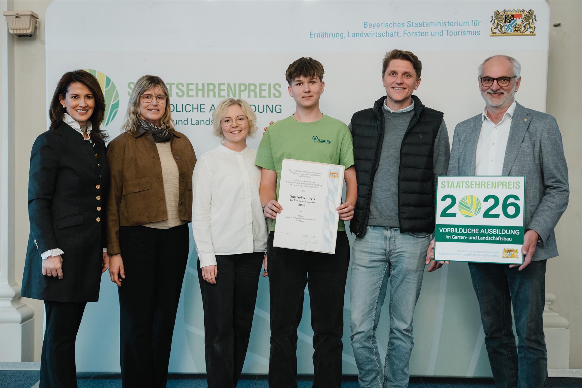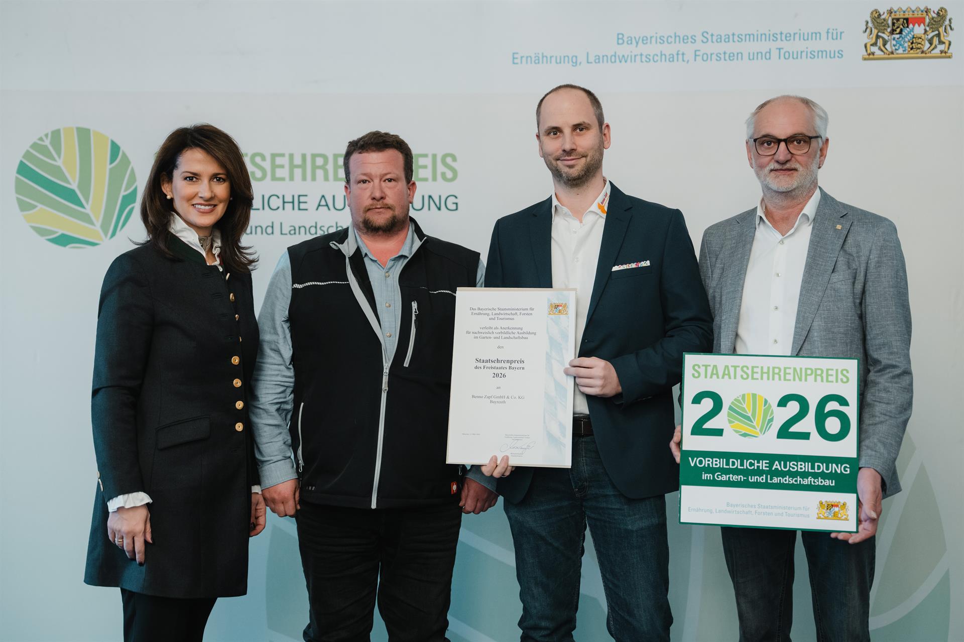 Zu den ausgezeichneten Unternehmen zählen Badum Garten- & Landschaftsbau aus Bamberg und Benno Zapf aus Bayreuth. Sie erhielten erstmals den Staatsehrenpreis für vorbildliche Ausbildung im Garten- und Landschaftsbau, überreicht von Ministerin Kaniber zusammen mit dem Verband Garten-, Landschafts- und Sportplatzbau Bayern (VGL Bayern). Zusätzlich durfte sich ebenfalls zum ersten Mal der Betrieb Bamberger Staudengarten Strobler über den Staatsehrenpreis für vorbildliche Ausbildung im Gartenbau freuen, der von der Staatsministerin und dem Bayerischen Gärtnerei-Verband (BGV) vergeben wurde.