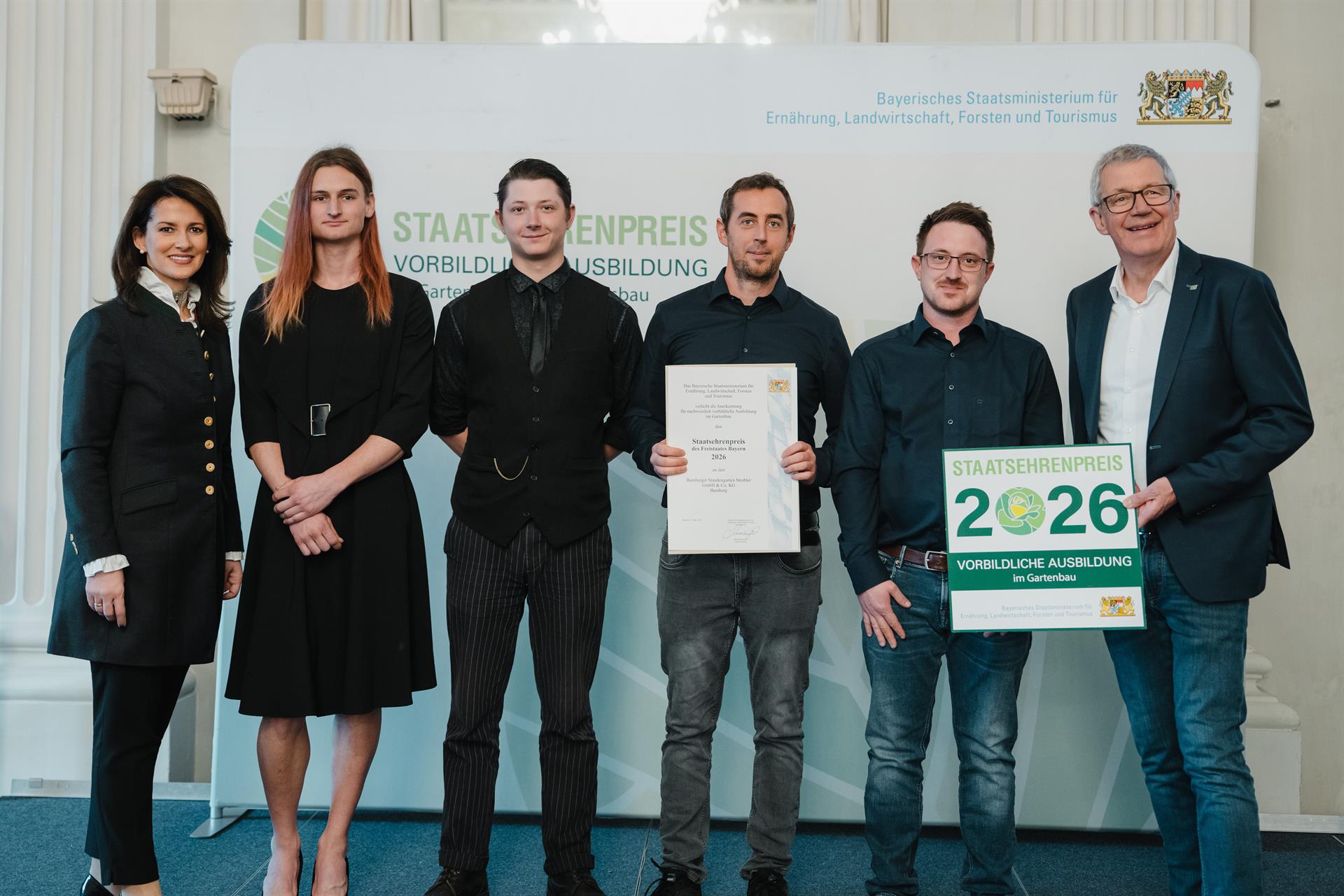 Für ihr außergewöhnliches Engagement in der Qualifizierung von Nachwuchskräften hat die bayerische Agrarministerin Michaela Kaniber 41 gärtnerische Betriebe – darunter drei aus Oberfranken – mit dem Staatsehrenpreis für vorbildliche Ausbildung 2026 geehrt. Die feierliche Preisverleihung fand am 12. März 2026 in der Münchner Residenz gemeinsam mit dem Verband Garten-, Landschafts- und Sportplatzbau Bayern und dem Bayerischen Gärtnerei-Verband statt.