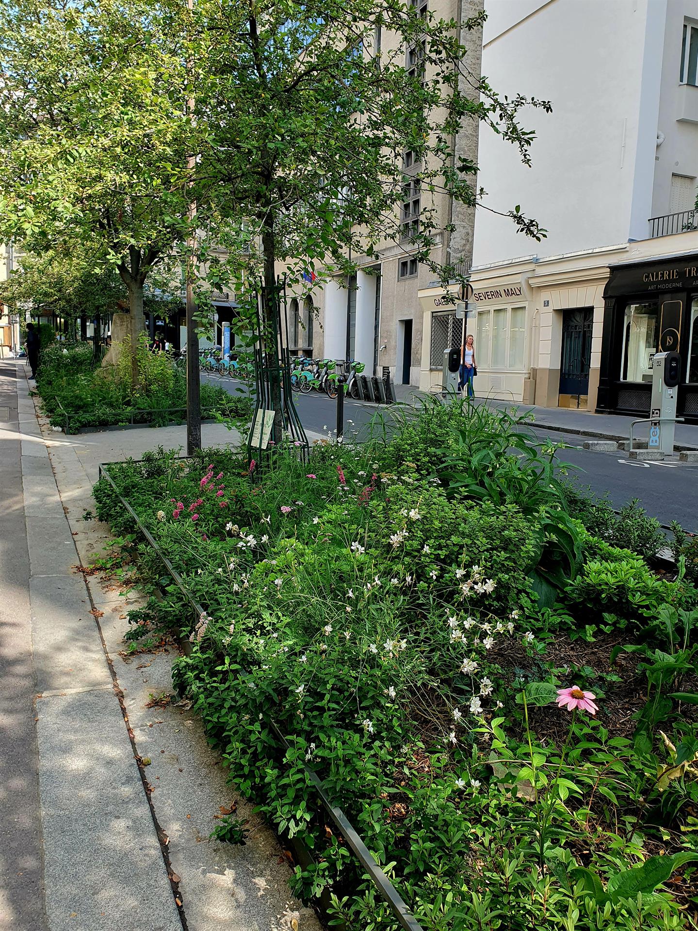 Die grünen Maßnahmen werden auf Schildern erklärt – nicht mit Schlagwörtern wie „blau-grüne Infrastruktur“, „Ökosystemleistung“ oder mit Performancewerten von Bäumen, sondern ganz einfach, sogar für Kinder verständlich. Jede und jeder soll begreifen: Es ist „unsere Stadt“, sie gilt es zu schützen. So wird im Jardin du Luxemburg, wo Tausende ihre Mittagspause, den Feierabend oder das Wochenende auf bequemen Liegestühlen oder beim Boulespiel verbringen, das Gras nicht mehr überall kurz geschoren. Stattdessen dürfen Wiesen entstehen. Man legt sich an den Rand des hohen Grases und achtet auf leise Geräusche. Dazu ermuntert der dezente Hinweis auf einem Schild: „Hörst Du es eigentlich summen?“ Darunter stehen anregende Fragen: „Warum brauchen wir Artenvielfalt und wie schafft man sie in der Stadt? Wie wichtig sind Bäume, Gärten, Parks, ja, jegliche Art von Grünfläche für den Wasserhaushalt, die Temperatur, die Tiere und Menschen?“