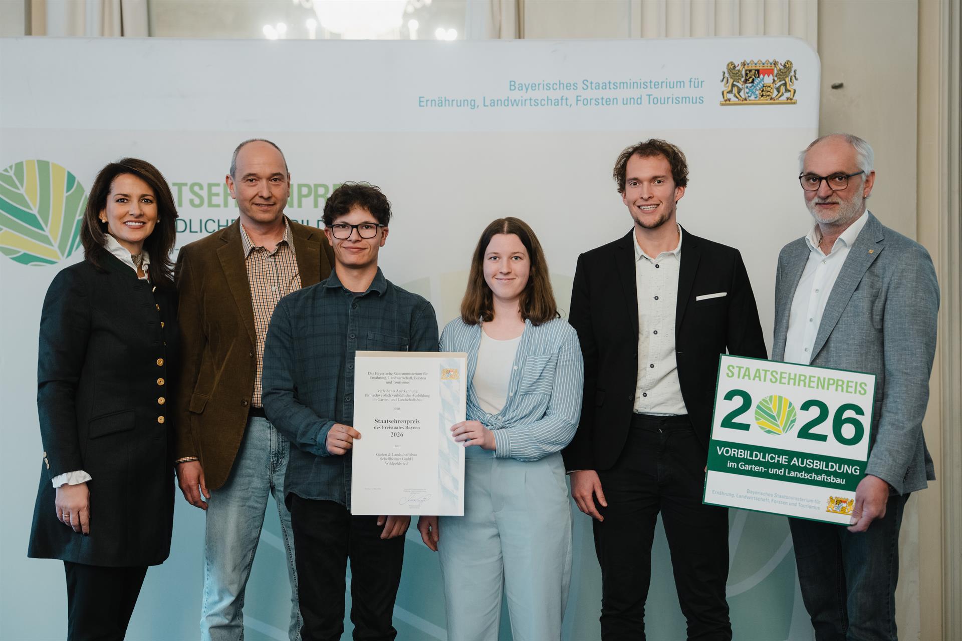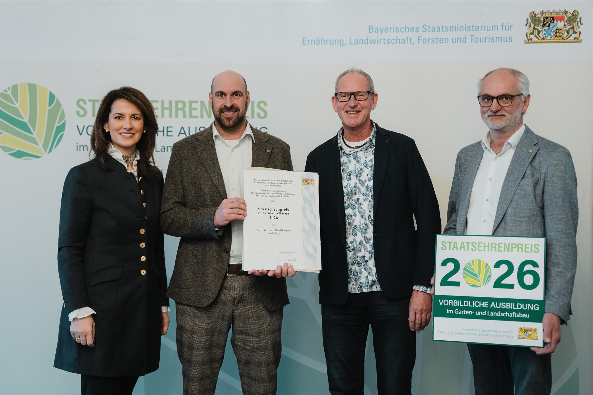 Für ihr außergewöhnliches Engagement in der Qualifizierung von Nachwuchskräften hat die bayerische Agrarministerin Michaela Kaniber 31 Betriebe – darunter drei aus Schwaben – mit dem Staatsehrenpreis für vorbildliche Ausbildung im Garten- und Landschaftsbau 2026 geehrt. Die feierliche Preisverleihung fand am 12. März 2026 in der Münchner Residenz gemeinsam mit dem Verband Garten-, Landschafts- und Sportplatzbau Bayern (VGL Bayern) statt.